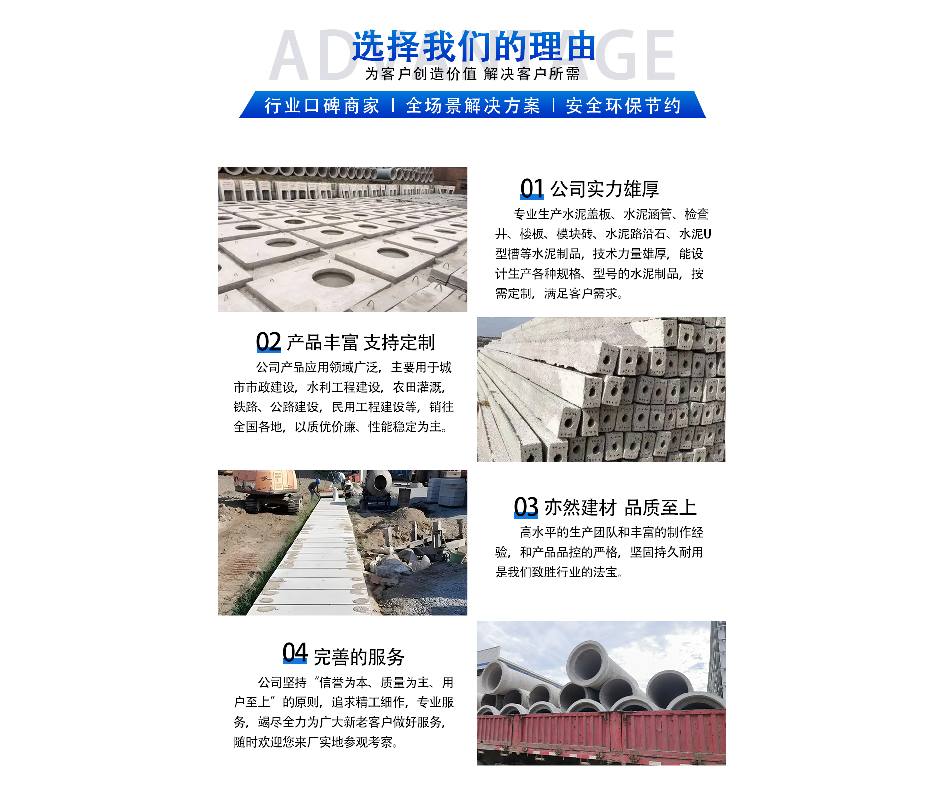 安徽亦然建材有限公司專業生產水泥涵管、水泥蓋板、檢查井、路沿石、水泥U型槽等各種水泥制品,公司技術先進,能設計、生產各種規格、型號的水泥制品,按需定制,滿足客戶需求,公司實力雄厚,加工設備齊全。